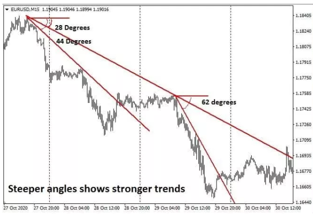 Look at the two trends that shift lower from the main trend. The first one is sloping more sharply at an angle of 44 degrees. And the next is the sharpest one, with a sloping angle of 62 degrees. In both, the trendline showing an angle of 62 degrees shows a more vigorous bearish intensity than the comparative one with a slope of 44 degrees.
