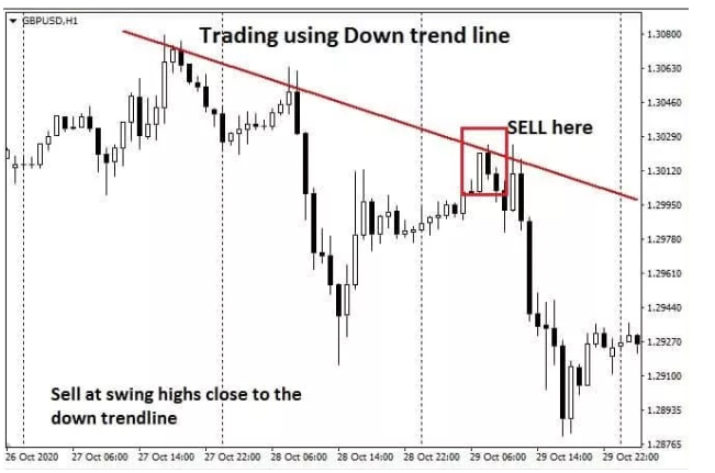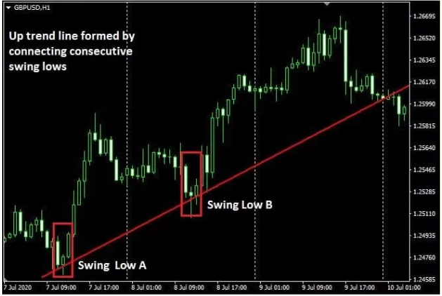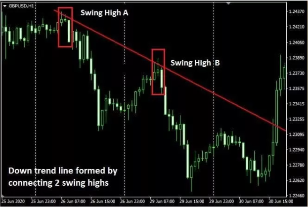To draw correct trendlines on price charts, you connect a straight line with two swing highs or swing lows on a chart.