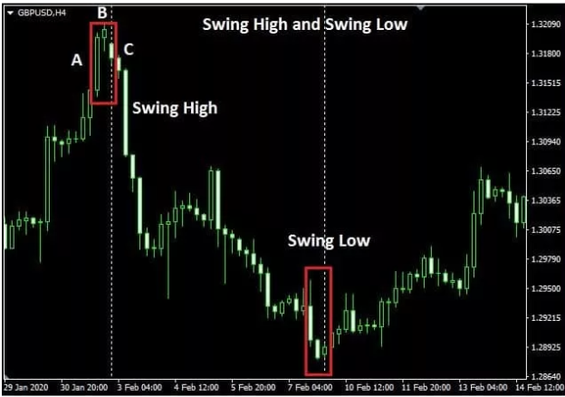 The highest position in the image below captures three candles, A, B, and C, locating the swing highs.