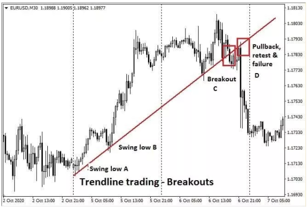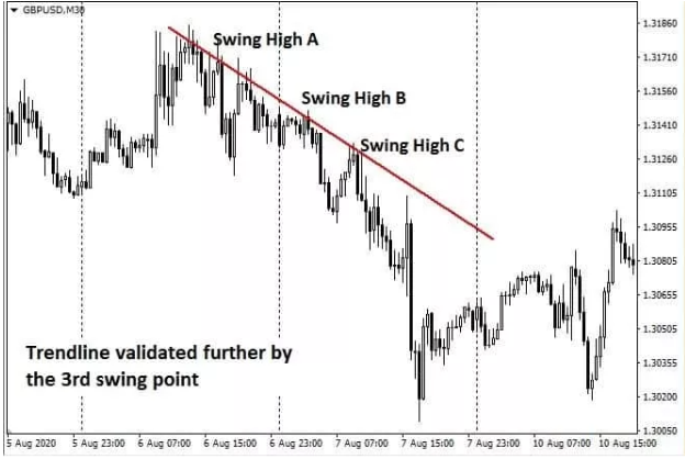 Looking at the image below, our initial trendline connects two swing highs, A and B. However, looking at swing C, it does not breach the trend line formation through subsequent price action.