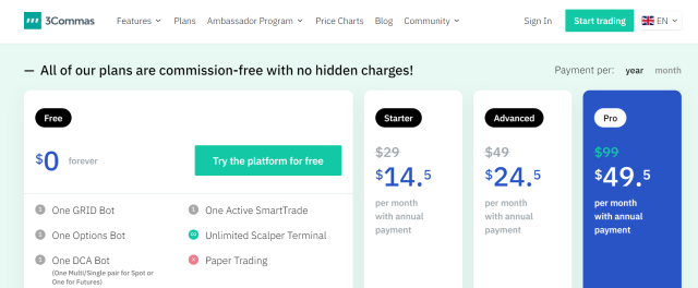 The 3Commas Grid trading bot uses an AI system that allows investors to not worry about picking limits. 3Commas Grid bots come in several combinations and are free for investors who actively use the trading platform.
